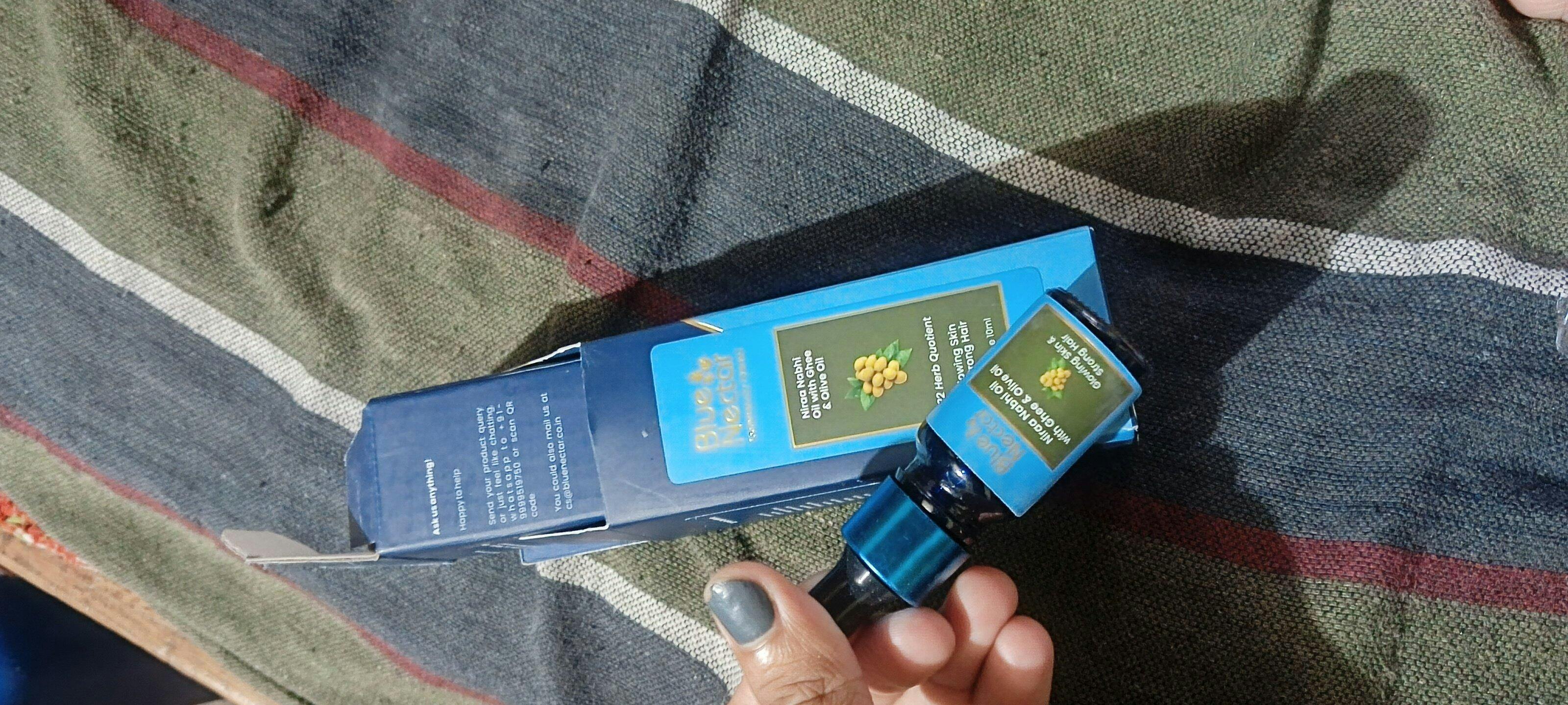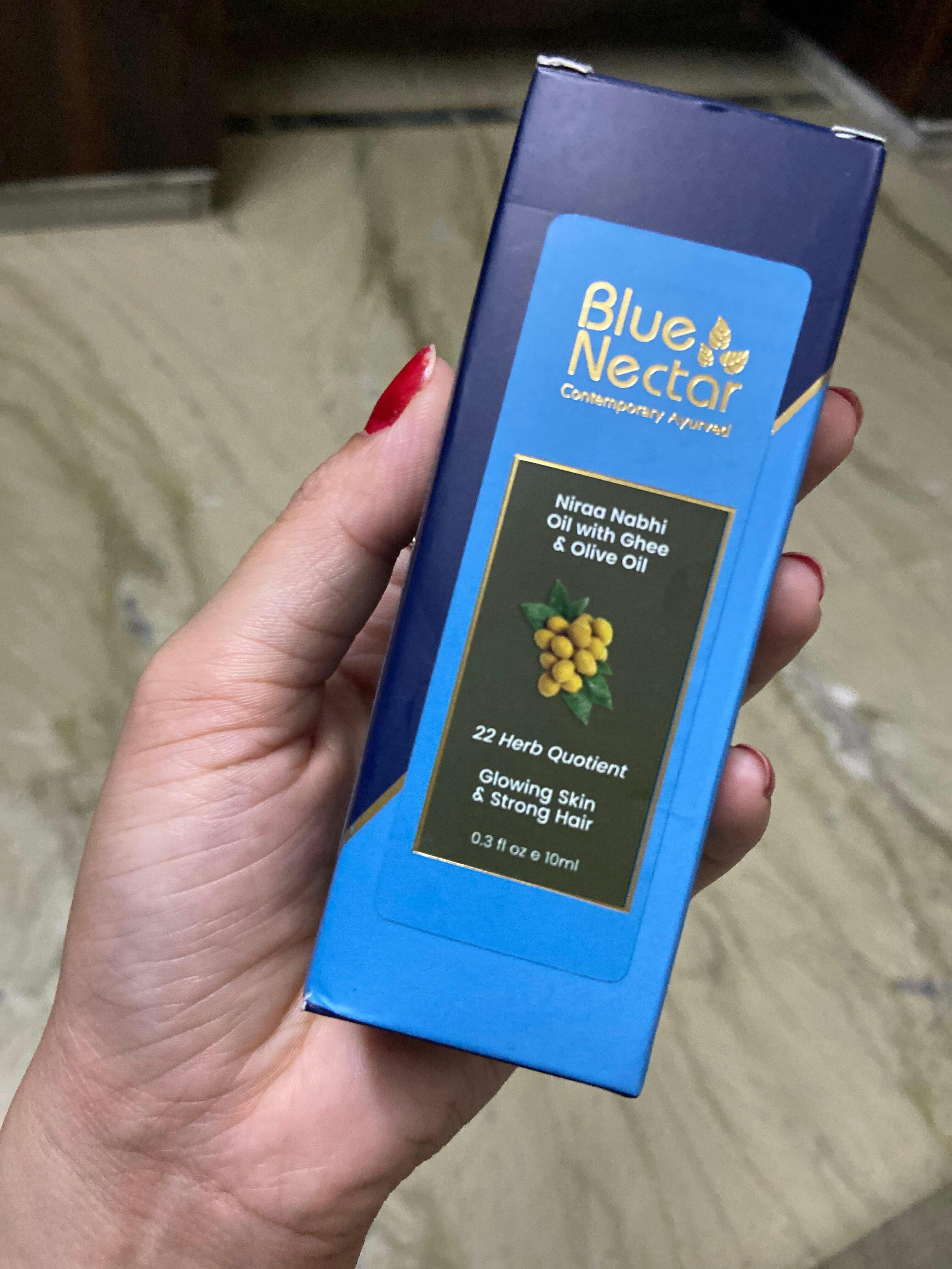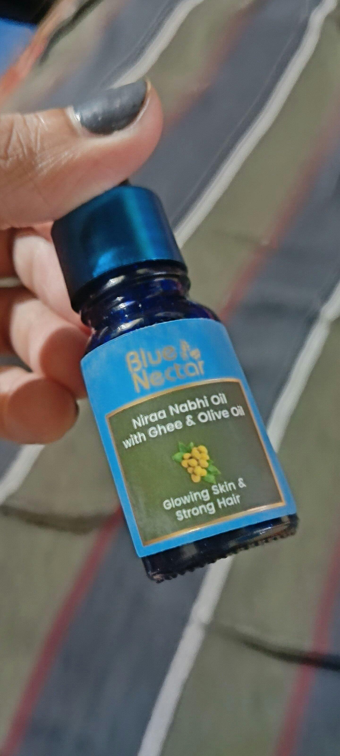 Blue Nectar Ghee and Olive Oil Nabhi Oil helps to brighten skin and strengthen hair. Ghee softens and brightens your skin, whereas olive oil strengthens hair roots, resulting in healthier, shinier hair. This fully natural combination, inspired by Ayurvedic principles, promotes overall health without using any chemicals. This product is suitable for all skin types and can be used daily. Simply apply 1-2 drops on your belly button and gently massage it for a minute before going to bed or having a bath.