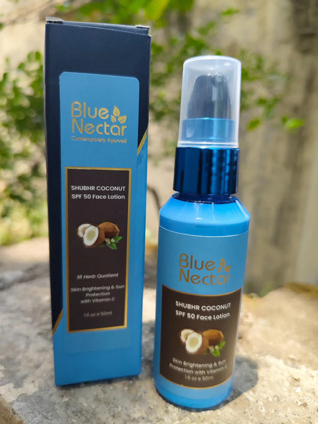 Blue Nectar Coconut Sunscreen SPF 50 Face Lotion provides broad-spectrum UVA & UVB protection without a white cast. Its lightweight, non-greasy composition moisturizes and improves texture. This natural sunscreen is infused with Green Tea and Coconut Water, providing hydration, soothing, and nourishing benefits for a refreshing feel. It is a safer, skin-friendly alternative to chemical sunscreens and is suitable for daily use.