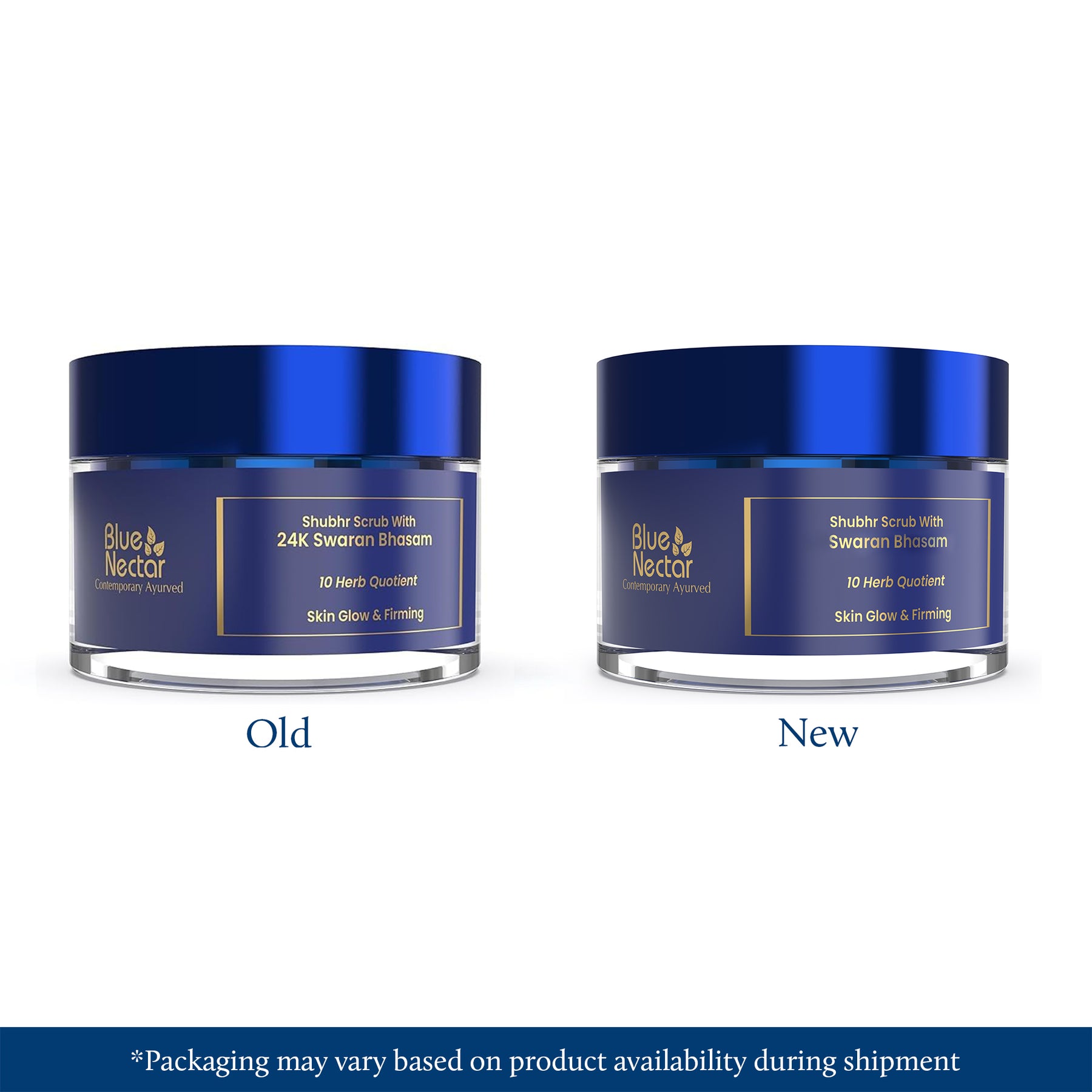 Blue Nectar Gold Face Scrub is enriched with 24K Swarna Bhasma (gold dust) and a blend of 12 Ayurvedic herbs. This Ayurvedic scrub acts as a powerful detan scrub & cleanser, removing tan & dull skin and also helps in skin firming. It is suitable for both oily and dry skin types. Rooted in Ayurvedic care and free from parabens, sulfates, and harsh chemicals, it helps improve skin texture and radiance.
