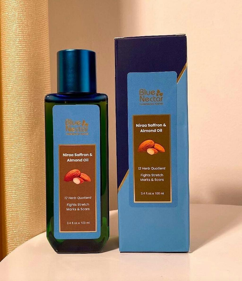 Blue Nectar Body Stretch Mark Oil is a potent mix of 12 herbs, enhanced with saffron and almond oil, that significantly reduces stretch marks, fine lines, and wrinkles. It is designed to significantly moisturize and nourish, making it ideal for usage throughout and after pregnancy. Sweet almond oil maintains the skin smooth and supple, while saffron brings out its natural shine and evens out the complexion. This oil acts as an excellent body polisher since it strengthens the skin barrier, producing a beautiful and healthy complexion. It is gentle on all skin types and has no harsh chemicals, making it a safe and relaxing choice for pregnant women and new mothers.